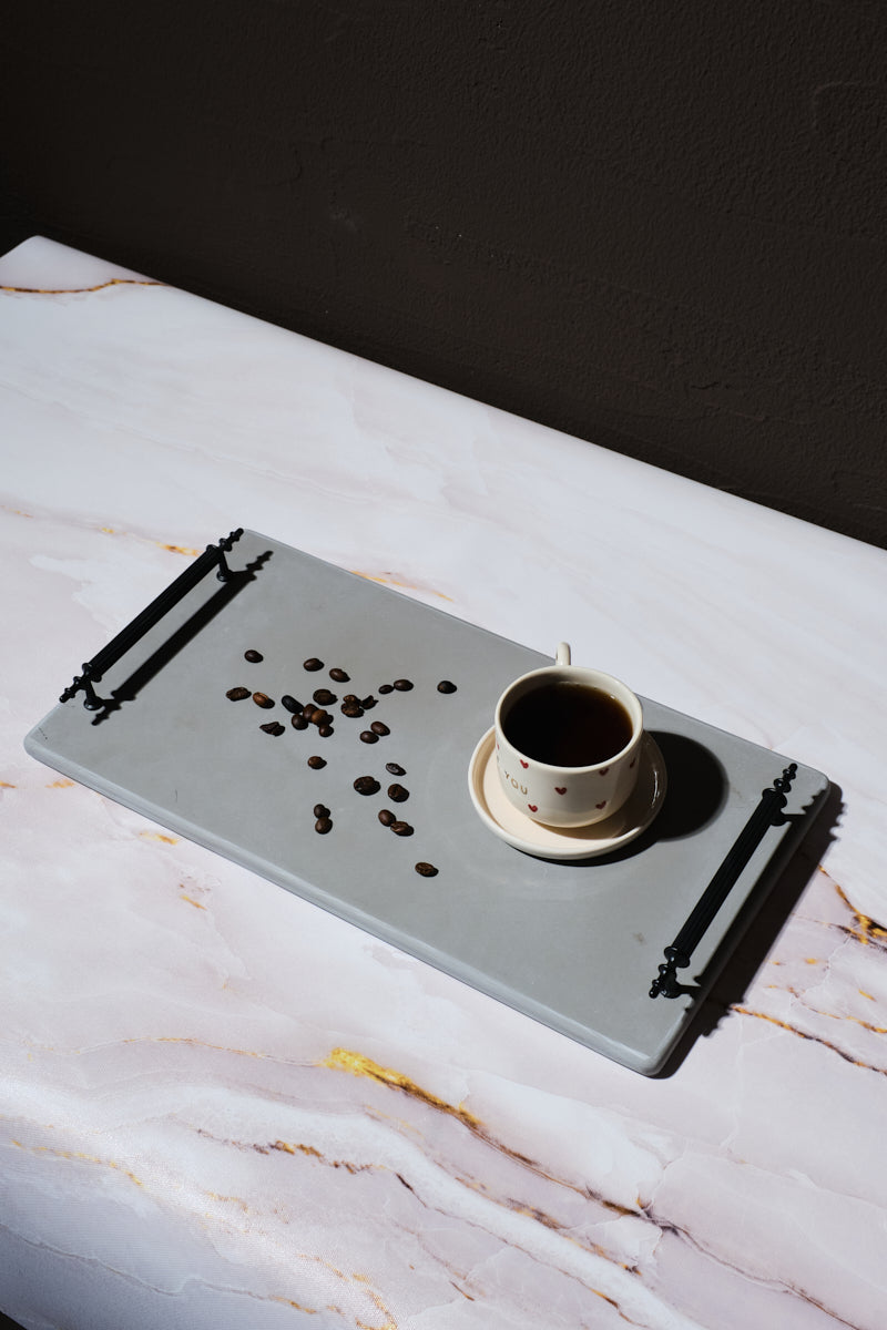 Cevap 1: Servis tepsisi, mat gri mermer efektli yüzeye ve rustik siyah metal kulplara sahiptir, bu da hem dayanıklılık hem de şıklık sağlar.